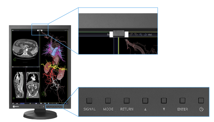 Portrait orientation is preferred when viewing medical images on 2 megapixel monitors. The RadiForce MX215 is designed so that the sensor and buttons are positioned according to this orientation.